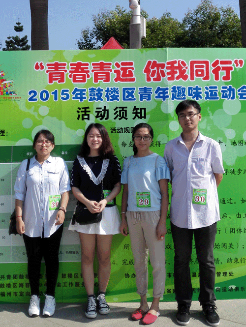 为迎接即将来临的第一届全国青年运动会,活跃鼓楼区青年文体生活,9月11日上午,我公司共派4名员工参加了鼓楼团区委联合区青年联合会、海容青少年社会工作服务中心在福州温泉公园举办“青春青运·你我同行”2015年鼓楼区青年趣味运动会。